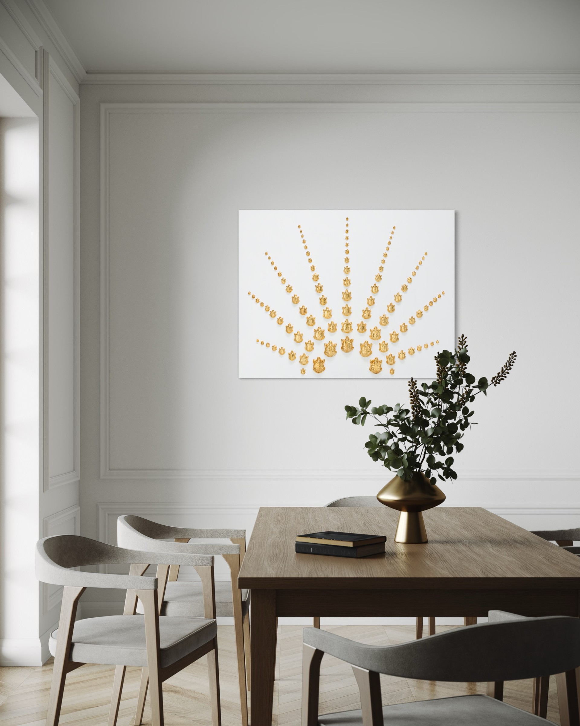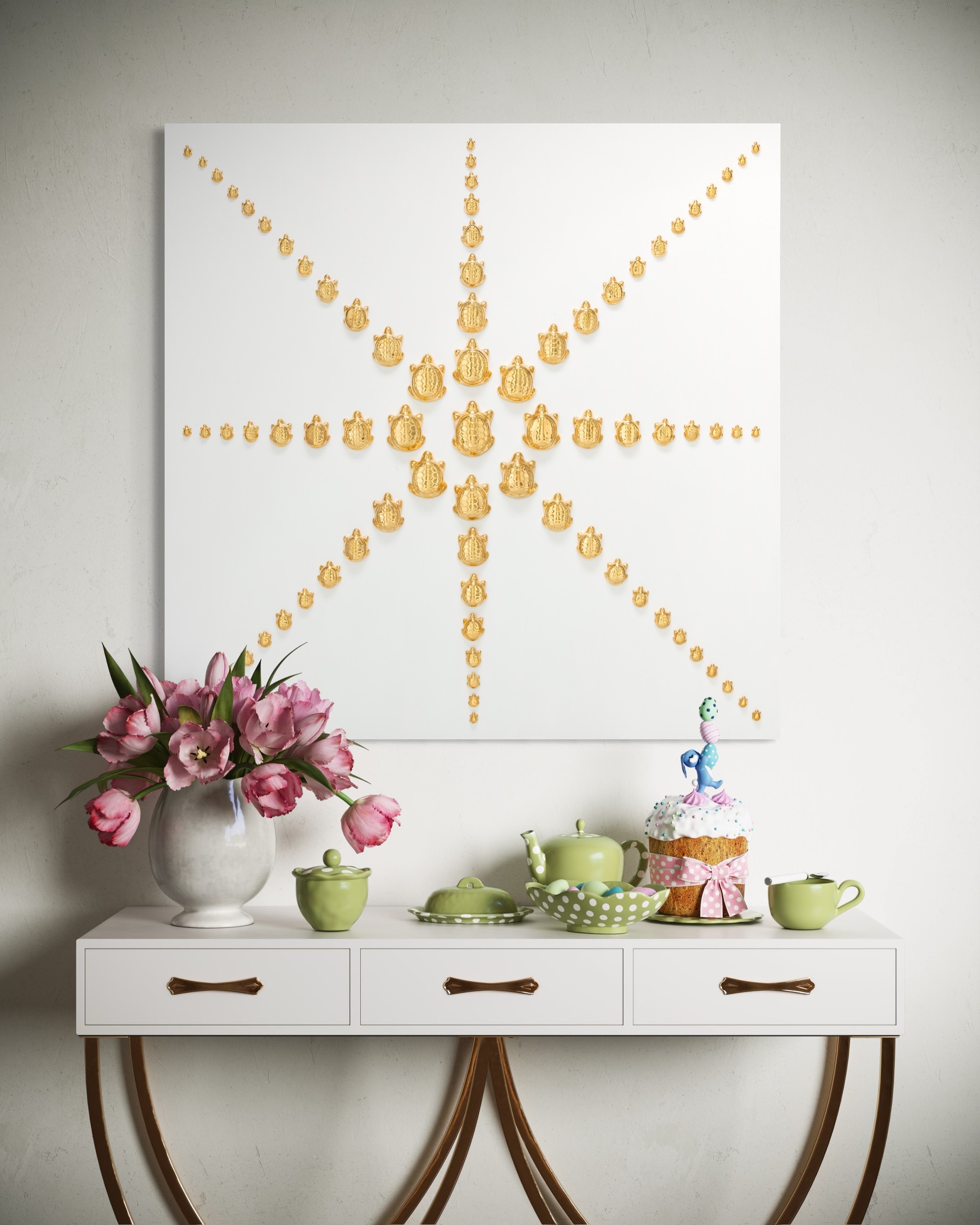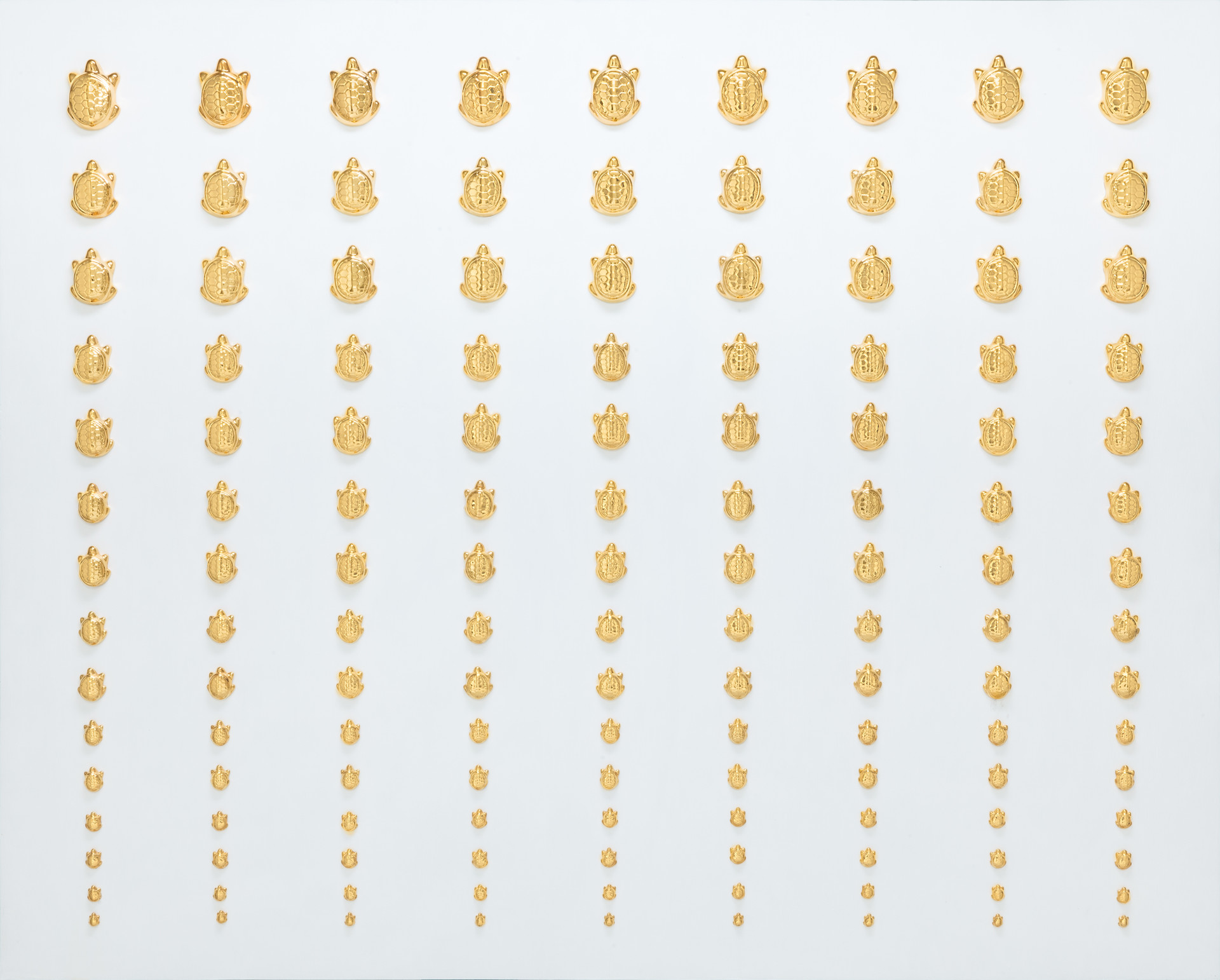 십장생 중 하나인 거북이는 보통 수명이 100년을 넘기는 동물로 알려져 있습니다. 종에 따라서는 200~300년 이상 생존하는 종도 있다고 합니다. 금거북이는 장수, 지혜, 안정과 지속적인 행운을 뜻합니다. 건강과 장수를 기원하고 행복과 풍요를 기원하는 마음으로 이 작품들을 제작했습니다.