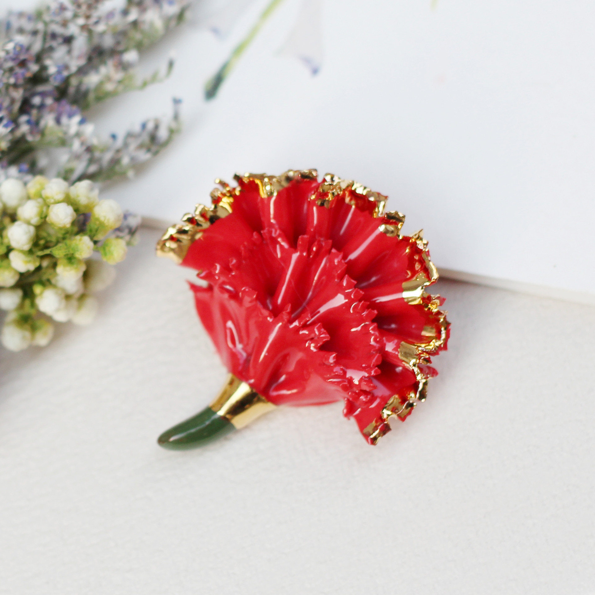 행운브로치는 감사브로치보다도 더 심플하고 단조로운 디자인입니다. 다른 디자인들과는 달리 꽃잎을 접어서 제작한 방식이 아니라 납작한 편입니다. 활짝 피어있는 카네이션을 부조로 표현해보았습니다.