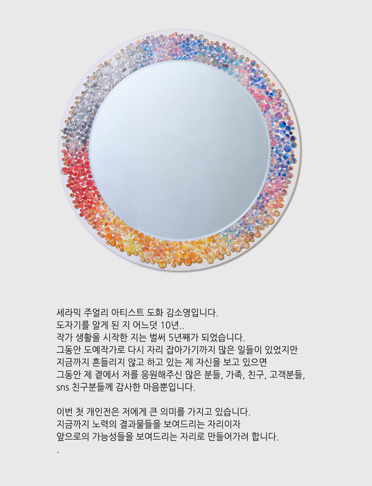 Kim So-young's first solo exhibition delves into the artist's inner emotions through ceramic painting. Over time, the artist has explored her inner world through this unique medium. In particular, themes such as the window to the soul, love, pain, excitement, obsession, beliefs, and carpe diem are expressed, presenting new artistic horizons. These themes reflect the various emotions the artist experiences and carries with her.