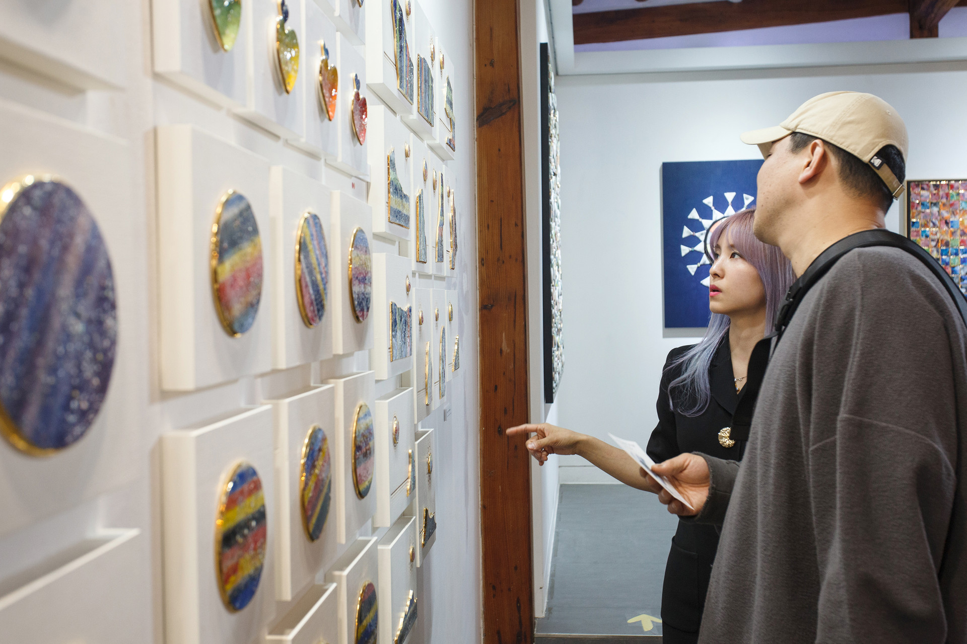 각 "우주별"은 모두 다른 빛과 색을 지니고 있으며, 다양한 모양으로 표현되어 있습니다. 어떤 작품은 강아지처럼 보이기도 하고, 새처럼 보이기도 하며, 달의 일부처럼 보이기도 합니다. 이러한 다양한 형태와 색채는 우주의 무한한 가능성과 다양성을 상징합니다.