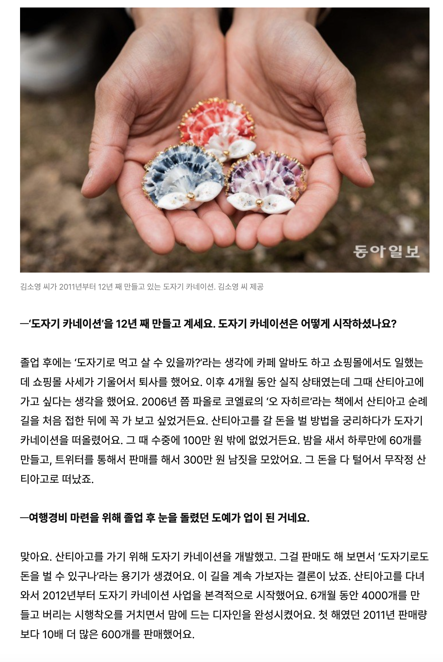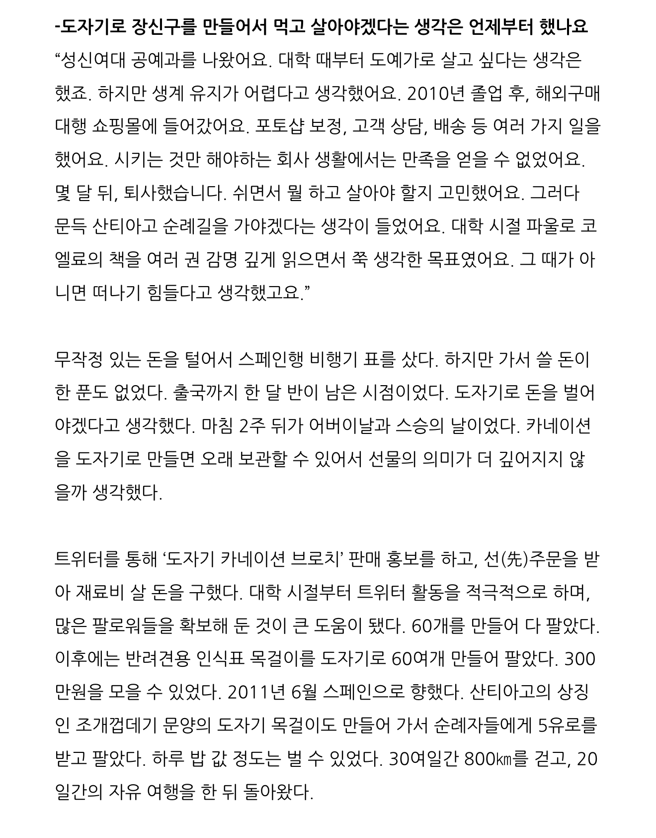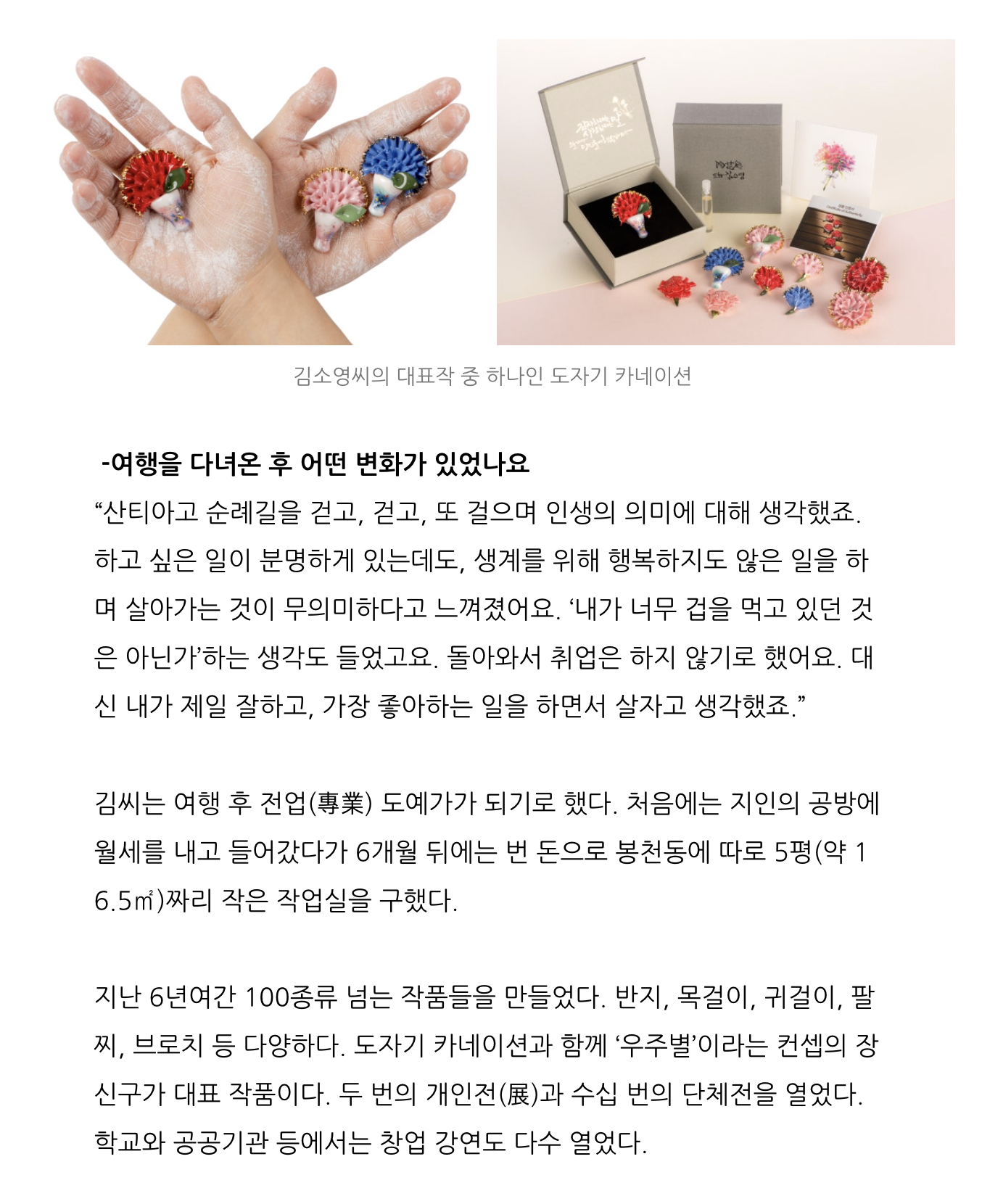 다녀와서 말 그대로 무일푼이 됐다. 그래도 ‘할 수 있다’는 용기를 얻은 덕분에 수공예 액세서리 전문 도예가의 길로 들어섰다. 여행 경비 마련을 위해 도자기로 카네이션 브로치와 반려동물 인식표 목걸이를 만들어 블로그, 트위터 등 SNS를 통해 판매한 게 경험이 됐다. 그는 순례길을 걸으면서도 직접 만든 도자기 공예품을 팔았다. 매일 ‘작품을 판다’는 하얀 천을 배낭에 달고 길을 걸었다.