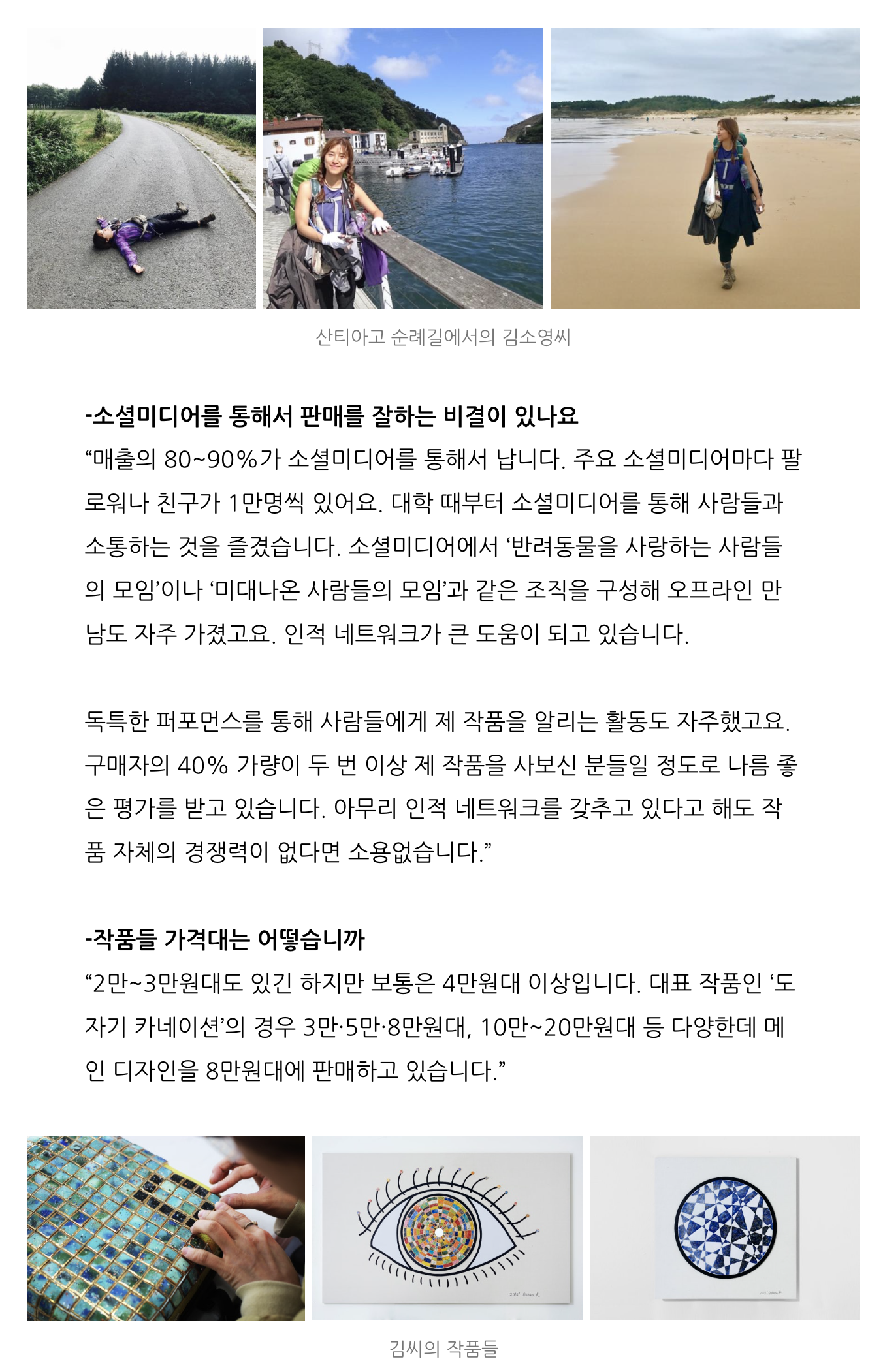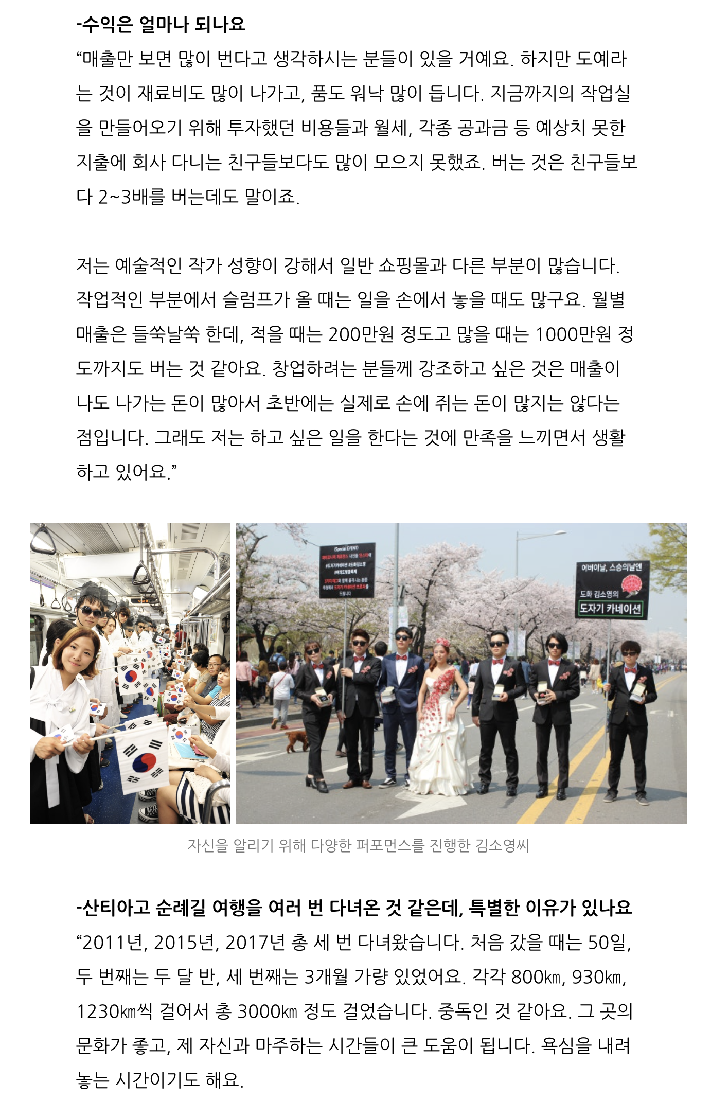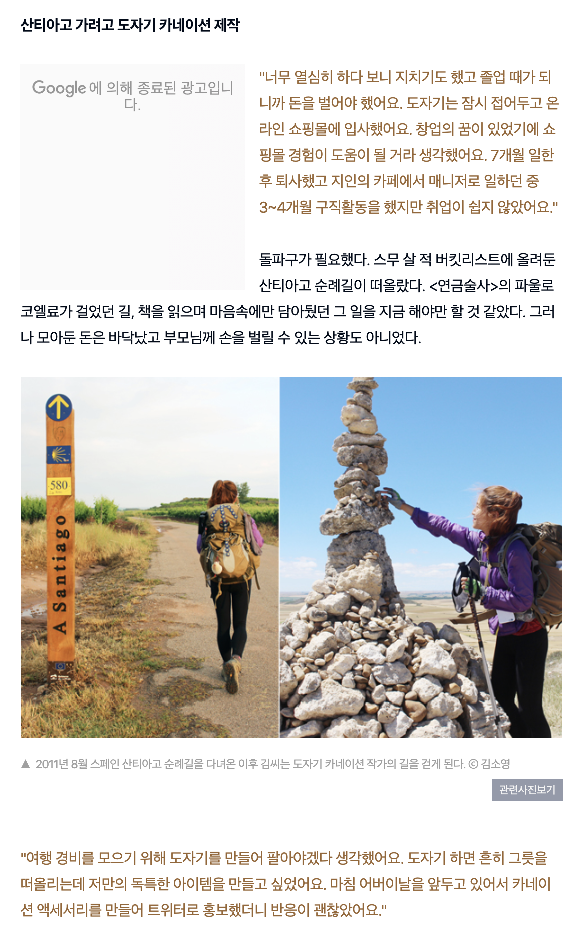 다녀와서 말 그대로 무일푼이 됐다. 그래도 ‘할 수 있다’는 용기를 얻은 덕분에 수공예 액세서리 전문 도예가의 길로 들어섰다. 여행 경비 마련을 위해 도자기로 카네이션 브로치와 반려동물 인식표 목걸이를 만들어 블로그, 트위터 등 SNS를 통해 판매한 게 경험이 됐다. 그는 순례길을 걸으면서도 직접 만든 도자기 공예품을 팔았다. 매일 ‘작품을 판다’는 하얀 천을 배낭에 달고 길을 걸었다.