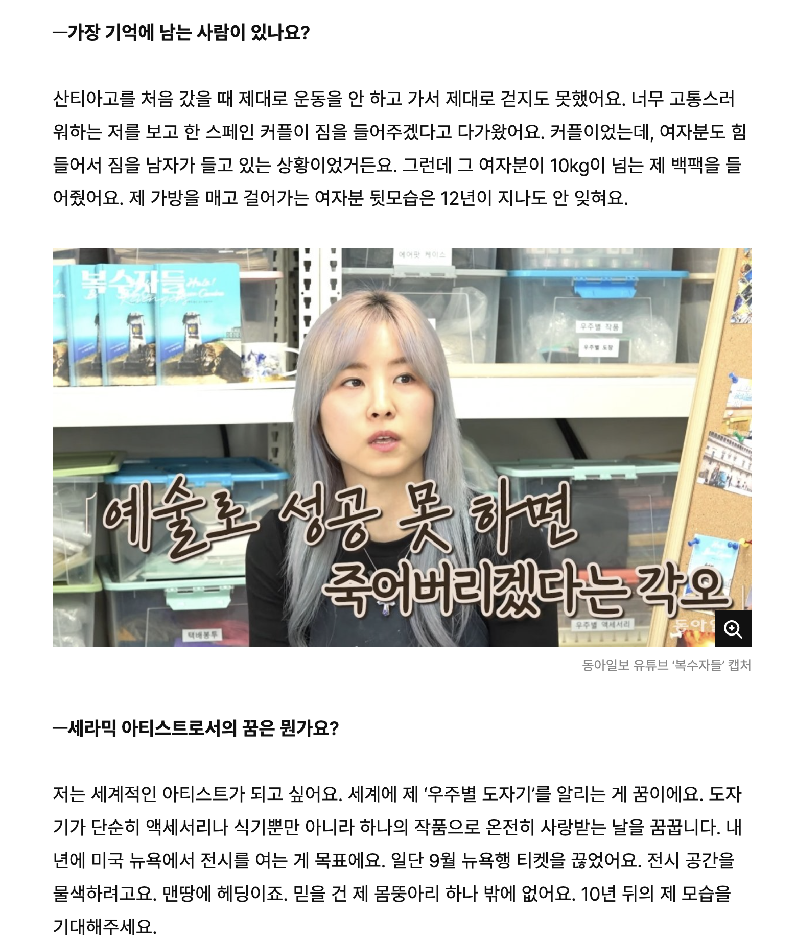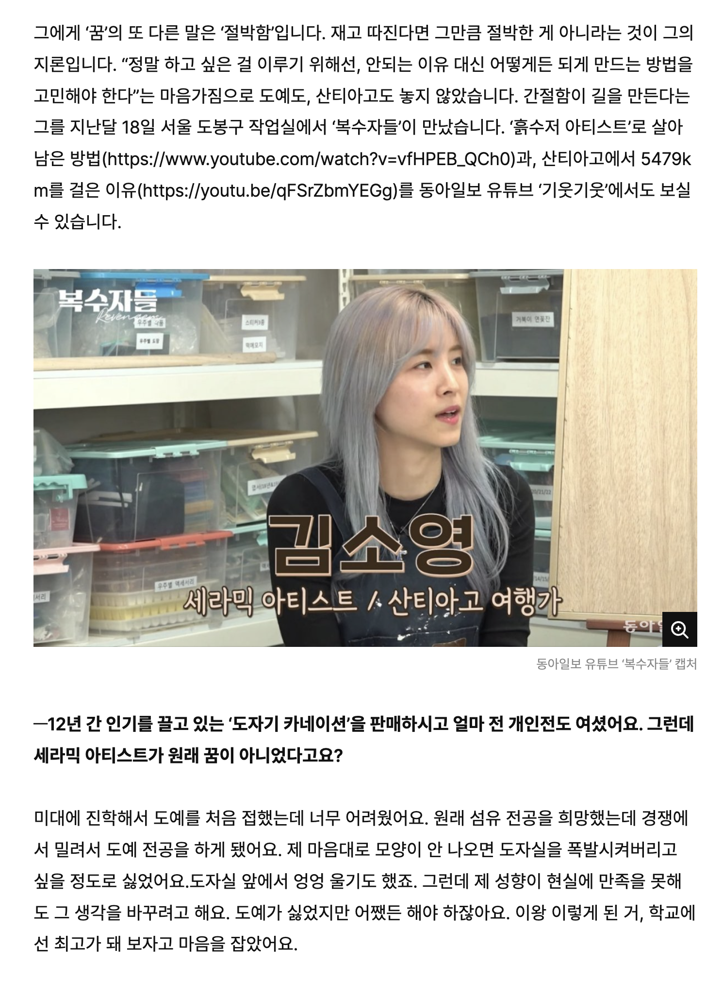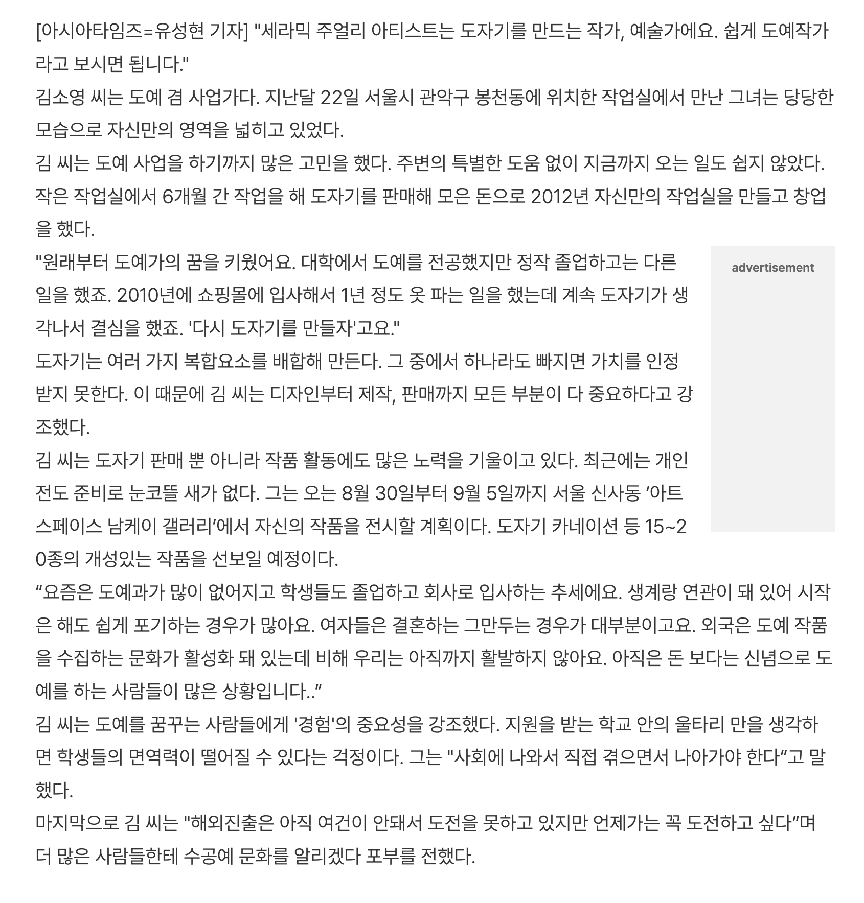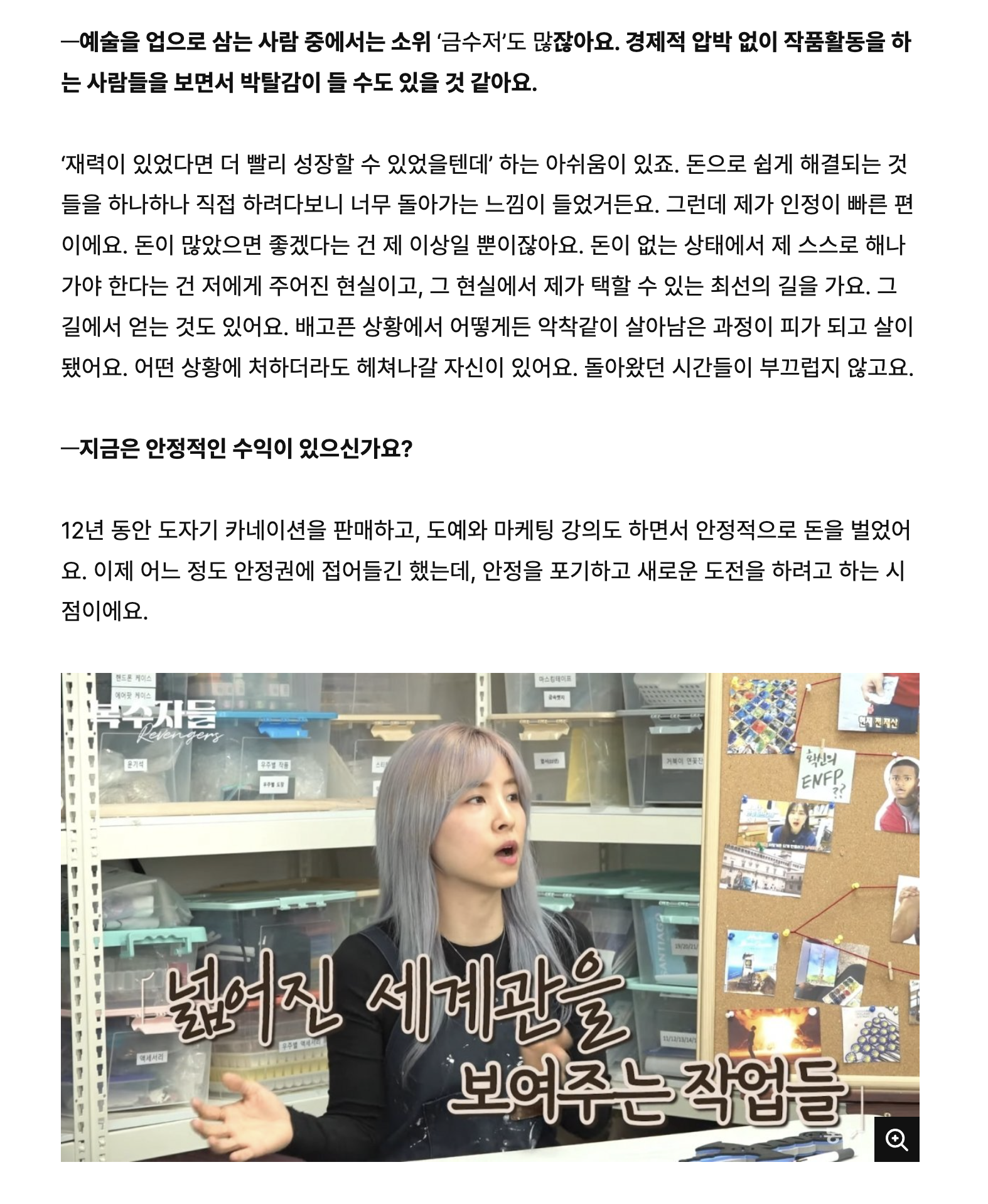 “요즘은 도예과가 많이 없어지고 학생들도 졸업하고 회사로 입사하는 추세에요. 생계랑 연관이 돼 있어 시작은 해도 쉽게 포기하는 경우가 많아요. 여자들은 결혼하는 그만두는 경우가 대부분이고요. 외국은 도예 작품을 수집하는 문화가 활성화 돼 있는데 비해 우리는 아직까지 활발하지 않아요. 아직은 돈 보다는 신념으로 도예를 하는 사람들이 많은 상황입니다..”