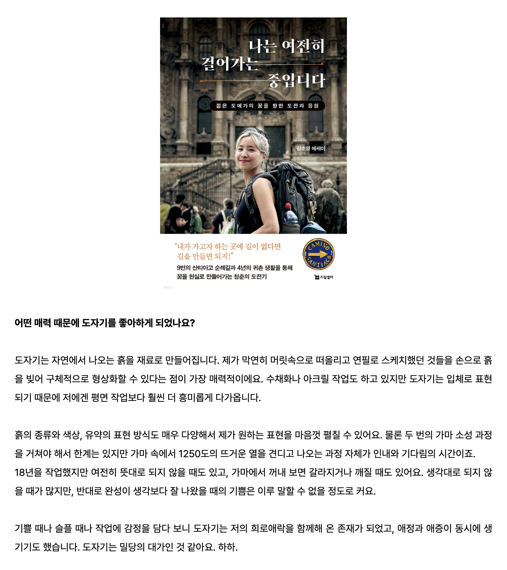 I’m Still Walking is more than just a reflection on the pilgrimage. It’s also an honest confession about the trials and hardships a young person faces in making a living. She shares how, despite deciding to live her life as a ceramic artist, she faced many challenges, including not finding a studio and eventually spending four years living alone in a mountain village in Gangwon-do at 700 meters above sea level. In that remote place, she had the chance to reflect on the conveniences and comforts she once took for granted in the city. The cold showers and lack of heating gave her a fresh perspective, allowing her to rediscover many things she had overlooked in her busy life in the city.