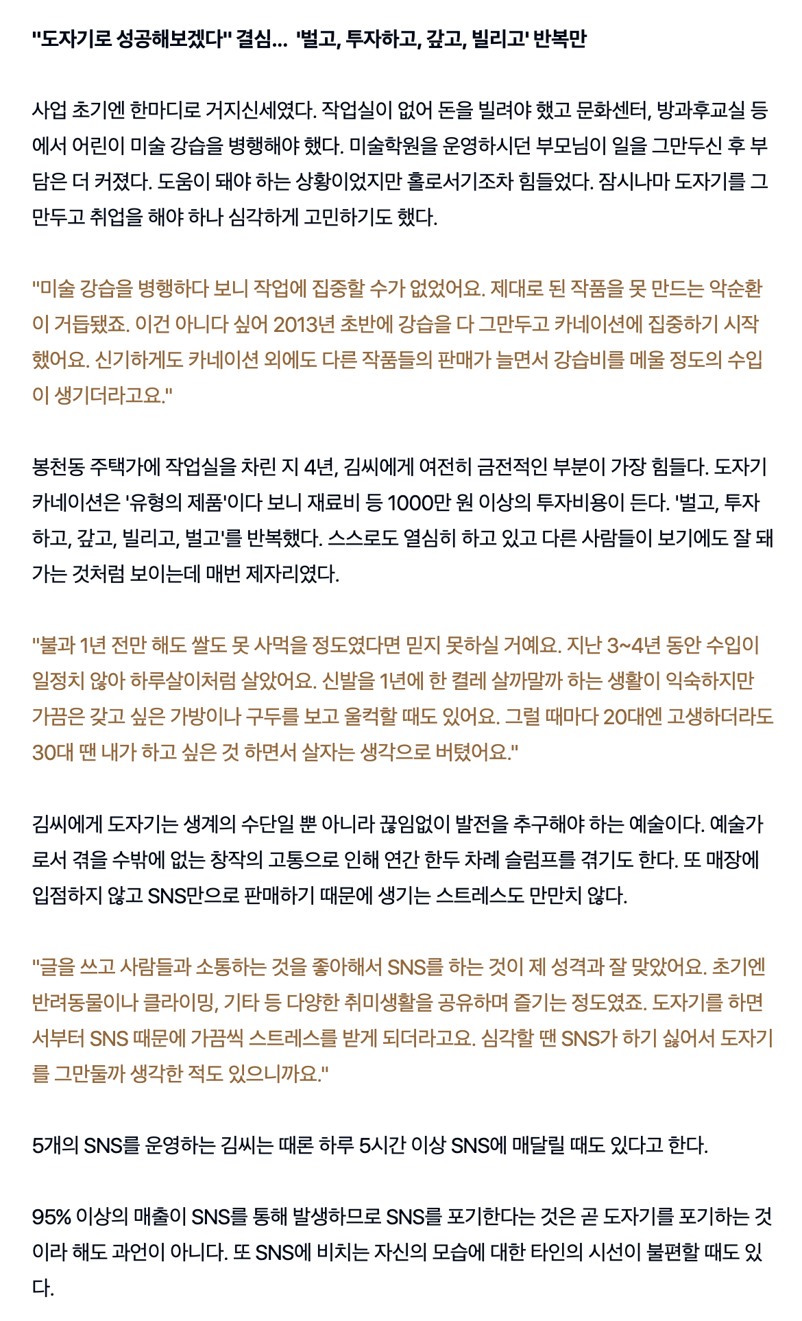 그는 대학에서 도자기를 전공했어요. 학부생이었던 시절엔 도자기를 하기 싫어서 펑펑 울기도 했어요. 시간이 지나 도자기의 매력에 푹 빠지게 된 그는 평생 업으로 삼죠. 졸업 이후 생계를 이어 나가기엔 쉽지 않았어요. 도자기라는 이상과 작업실 월세라는 현실에서 좌절하기도 했죠.