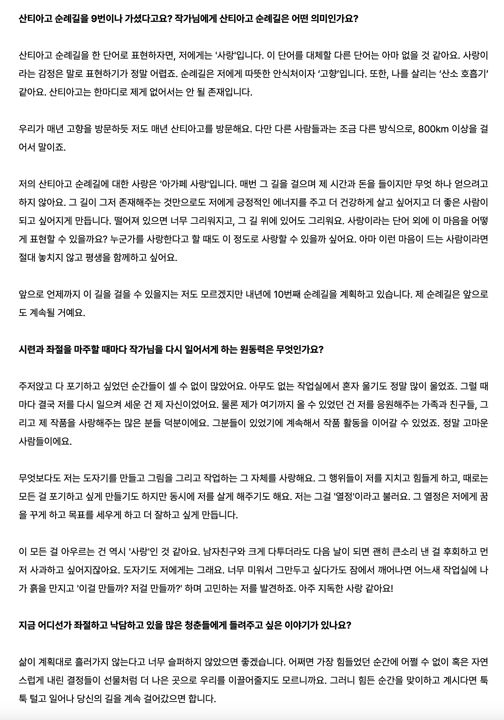 저의 산티아고 순례길에 대한 사랑은 '아가페 사랑'입니다. 매번 그 길을 걸으며 제 시간과 돈을 들이지만 무엇 하나 얻으려고 하지 않아요. 그 길이 그저 존재해주는 것만으로도 저에게 긍정적인 에너지를 주고 더 건강하게 살고 싶어지고 더 좋은 사람이 되고 싶어지게 만듭니다. 떨어져 있으면 너무 그리워지고, 그 길 위에 있어도 그리워요. 사랑이라는 단어 외에 이 마음을 어떻게 표현할 수 있을까요? 누군가를 사랑한다고 할 때도 이 정도로 사랑할 수 있을까 싶어요. 아마 이런 마음이 드는 사람이라면 절대 놓치지 않고 평생을 함께하고 싶어요.