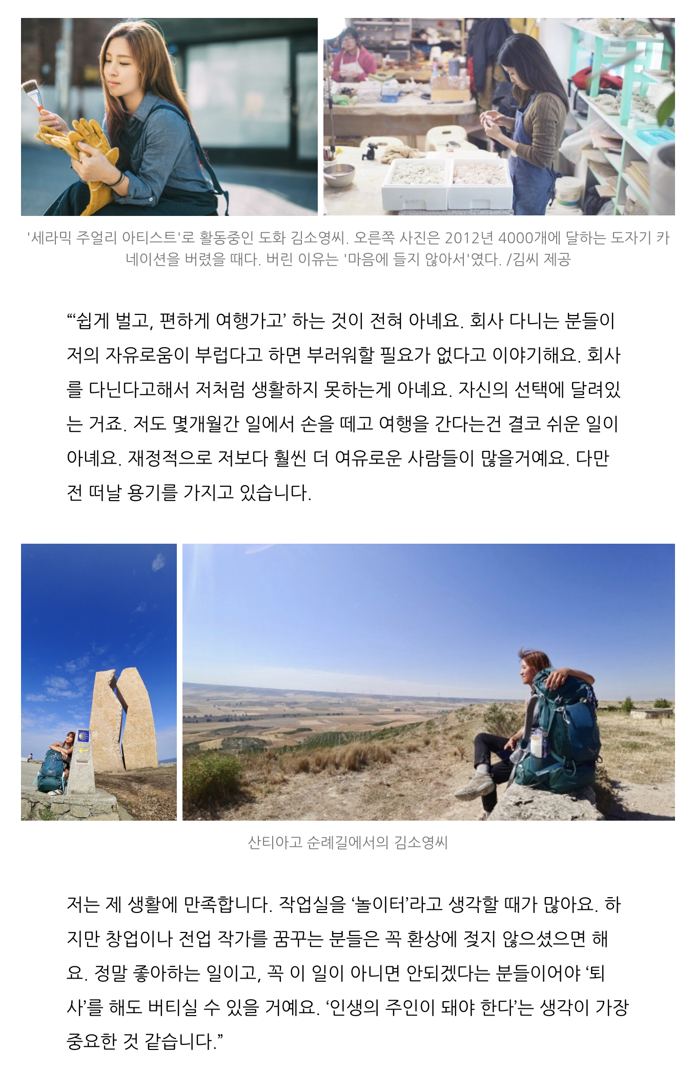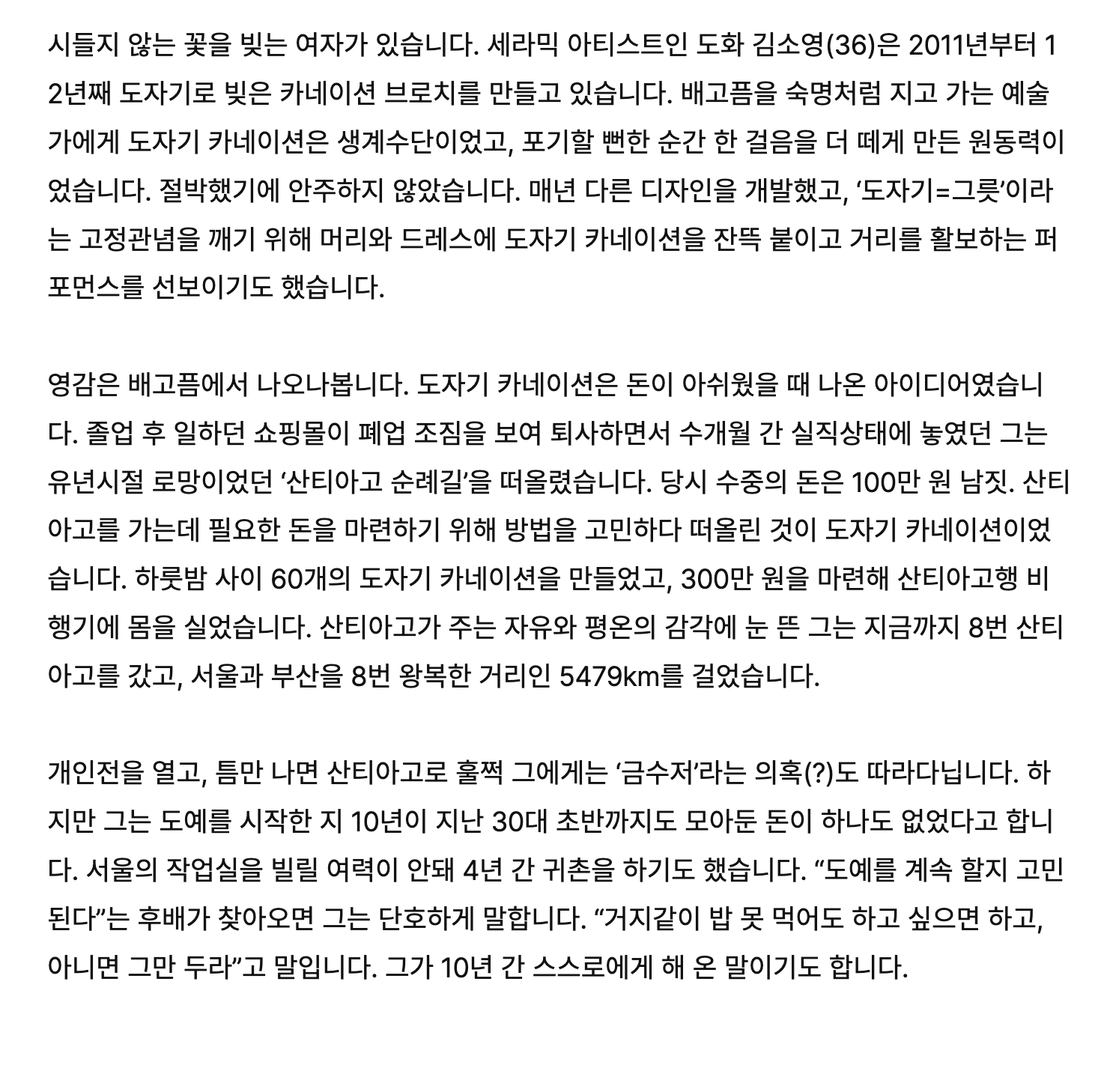하지만 4년간 돈을 벌고, 빌리고, 갚고, 투자하며 사업을 하는 동안 몸과 마음은 지쳐갔다. 도자기 공예를 계속할 수 있을 지 회의감도 들었다. 좋아서 뛰어든 도예지만 전업작가로서 생계를 꾸려나가는 건 다른 문제다. 결국 2015년, 모든 것을 내려놓고 두번째 산티아고 순례길을 걸었다.