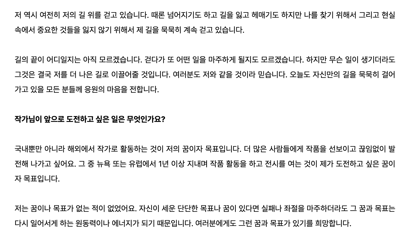 국내뿐만 아니라 해외에서 작가로 활동하는 것이 저의 꿈이자 목표입니다. 더 많은 사람들에게 작품을 선보이고 끊임없이 발전해 나가고 싶어요. 그 중 뉴욕 또는 유럽에서 1년 이상 지내며 작품 활동을 하고 전시를 여는 것이 제가 도전하고 싶은 꿈이자 목표입니다.