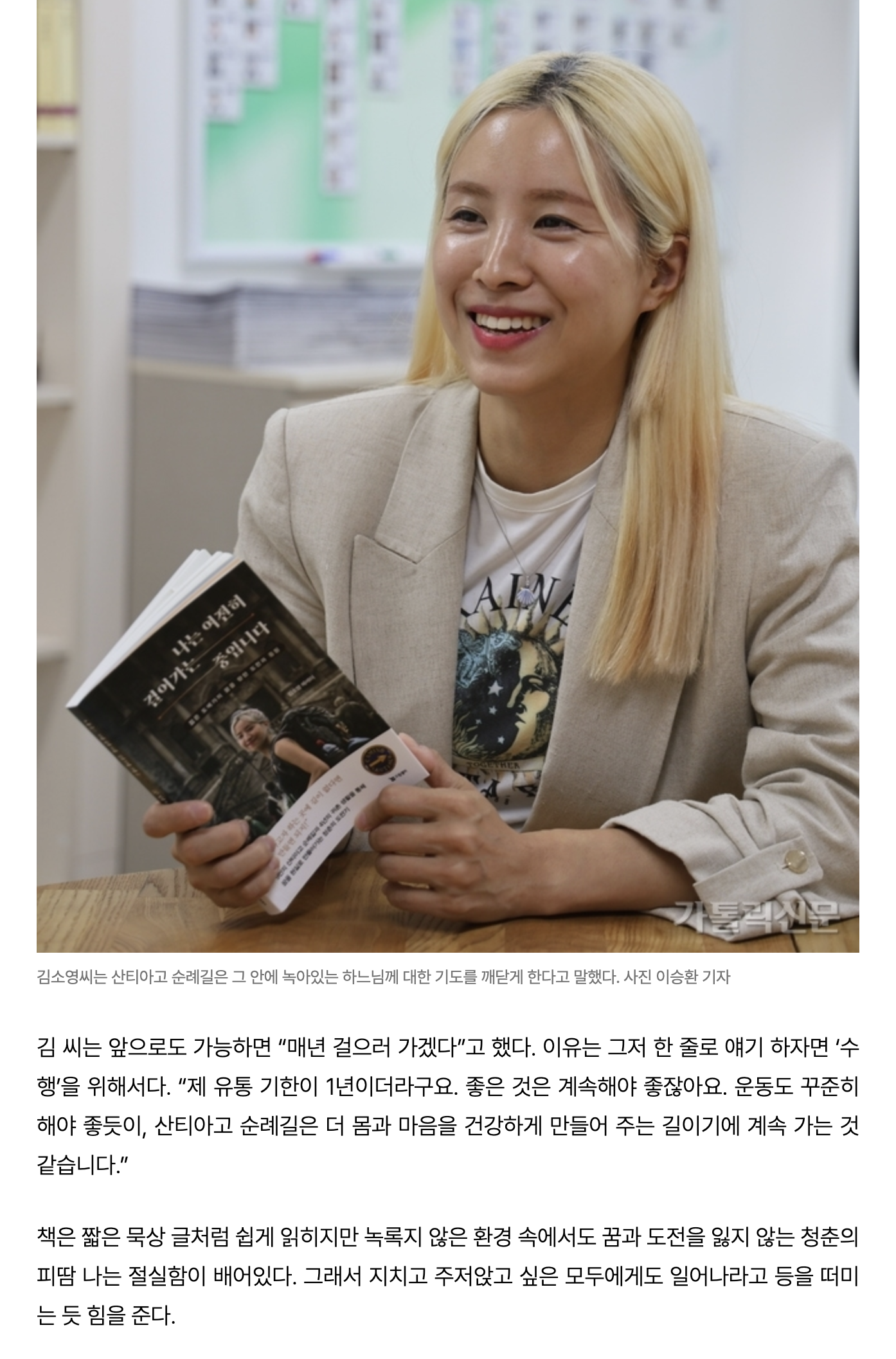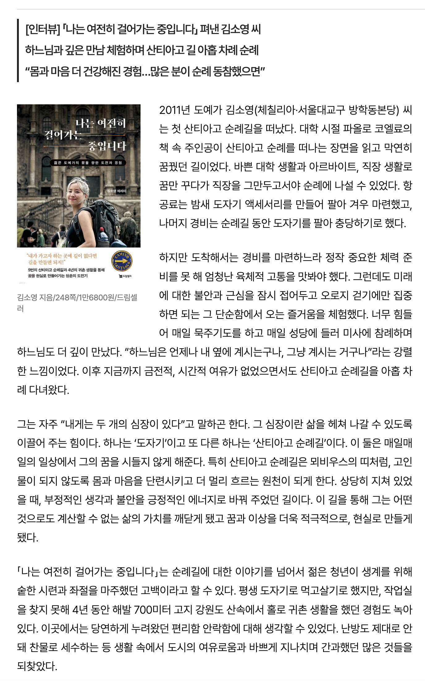 그는 “책을 읽고 20대 청년들과 신앙인들이 산티아고 순례길 걷기에 많이 도전했으면 좋겠다”고 했다. “오랜 시간 신자들이 순례했던 길입니다. 그 안에 녹아있는 하느님께 대한 기도를 깨닫는 깊은 체험을 하실 것 같습니다.”