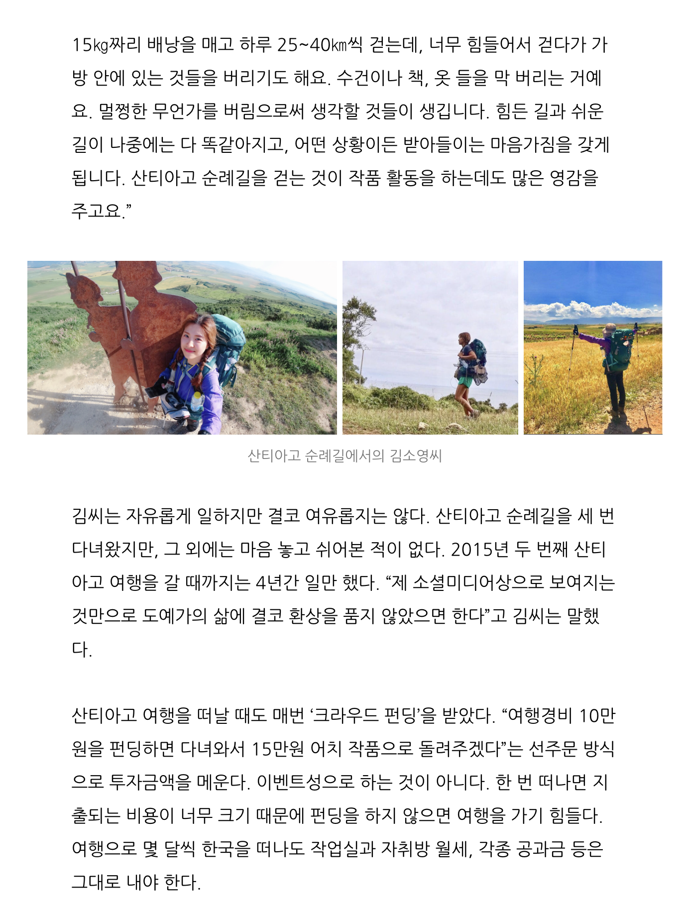 김소영 작가는 지난해 12월 4번째 산티아고 순례여행을 마쳤다. 그녀가 지금껏 산티아고 순례길을 걸은 거리를 합하면 모두 4천40km, 300km 정도인 서울 잠실-광주 충장로를 13번 이상 걸은 셈이다.