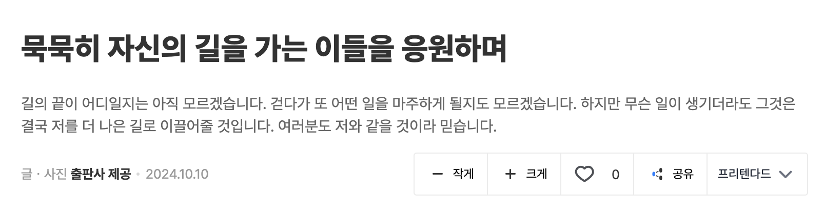 길의 끝이 어디일지는 아직 모르겠습니다. 걷다가 또 어떤 일을 마주하게 될지도 모르겠습니다. 하지만 무슨 일이 생기더라도 그것은 결국 저를 더 나은 길로 이끌어줄 것입니다. 여러분도 저와 같을 것이라 믿습니다. 오늘도 자신만의 길을 묵묵히 걸어가고 있을 모든 분들께 응원의 마음을 전합니다.