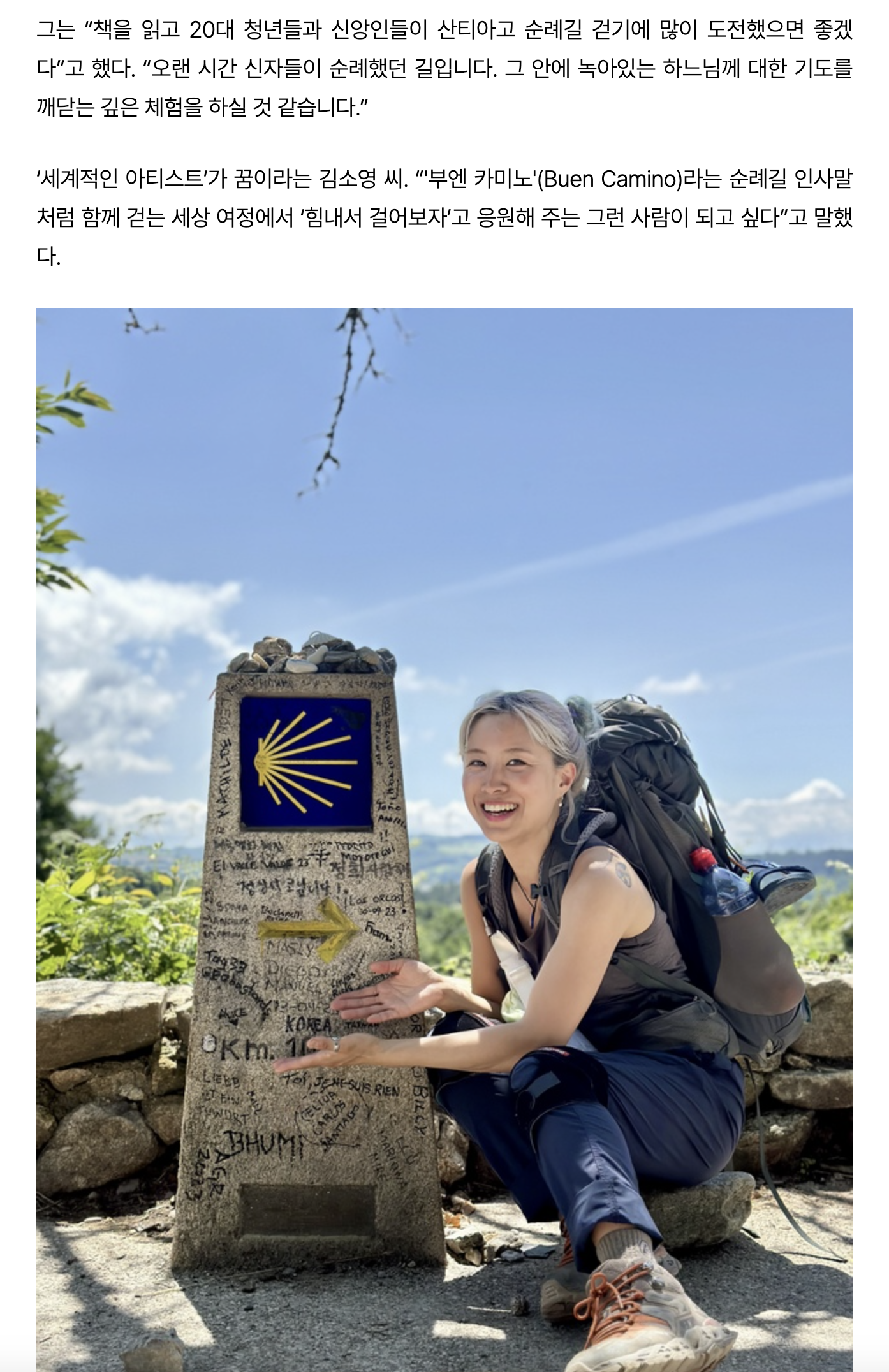 Kim So-young, who dreams of becoming a world-class artist, says, “Just like the greeting ‘Buen Camino’ (Good Path) on the pilgrimage, I want to be a person who encourages others on their journey through life, saying ‘Let’s keep walking with strength.’”