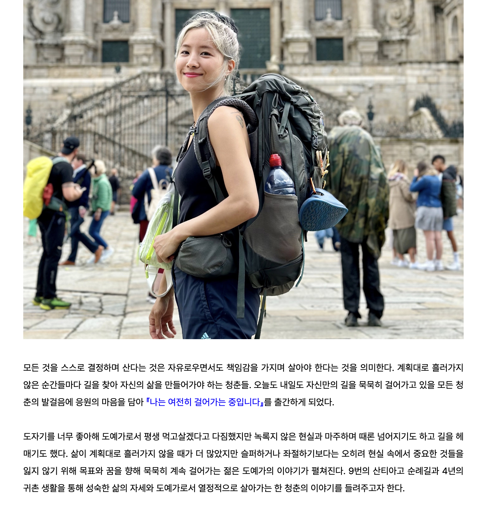 Kim So-young has plans to continue walking the Camino every year if possible. When asked why, she simply says, “For the purpose of ‘spiritual training.’” “I realized my shelf life is only one year. Good things need to be continued. Just like how regular exercise is good for your body, the Camino keeps my body and mind healthy, so I will keep going.”