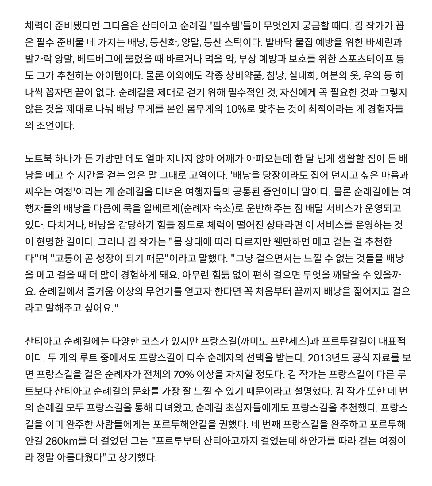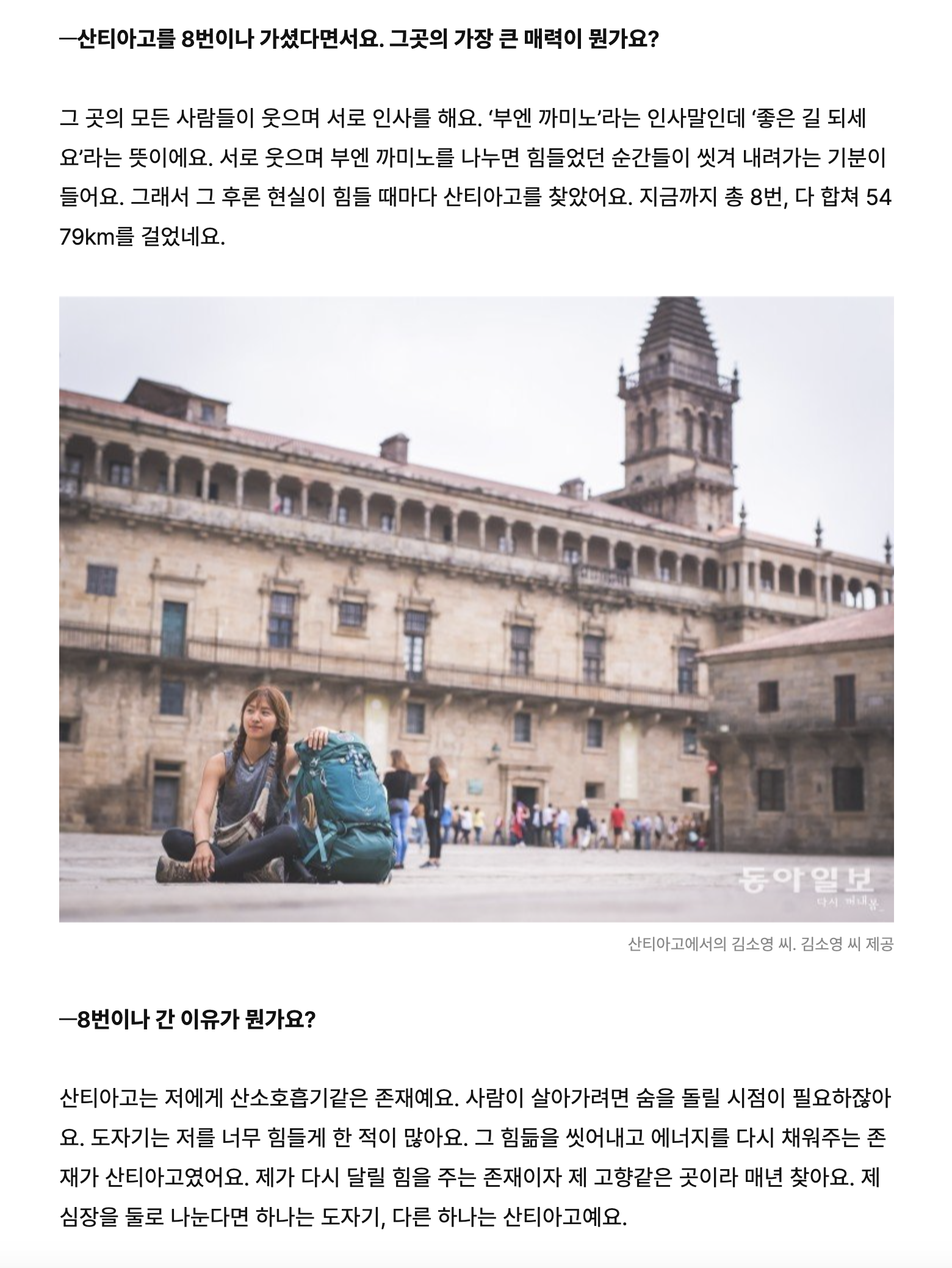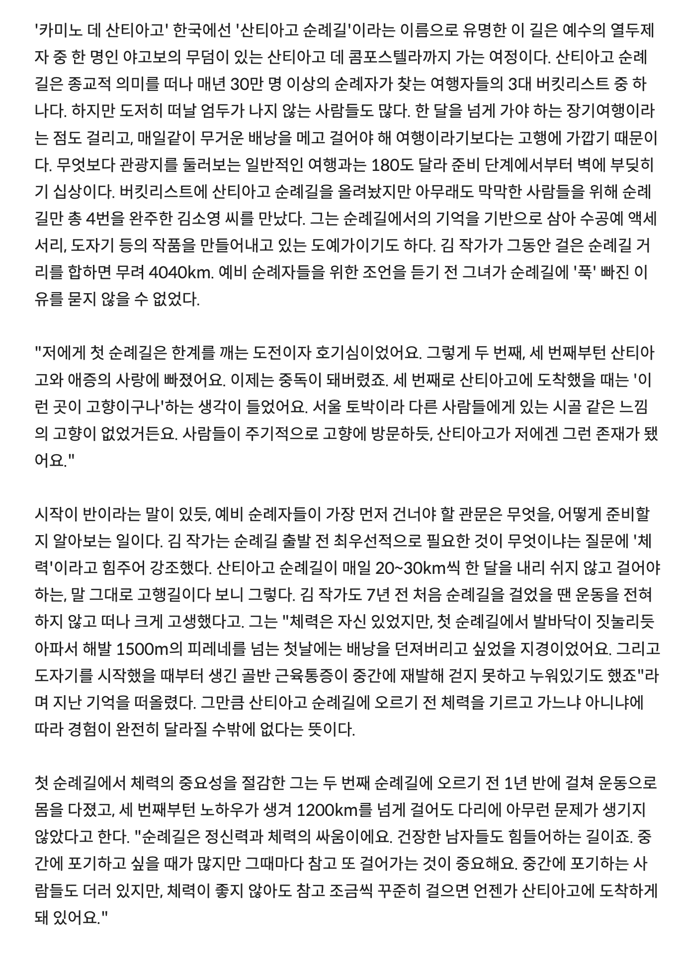 김 씨는 앞으로도 가능하면 “매년 걸으러 가겠다”고 했다. 이유는 그저 한 줄로 얘기 하자면 ‘수행’을 위해서다. “제 유통 기한이 1년이더라구요. 좋은 것은 계속해야 좋잖아요. 운동도 꾸준히 해야 좋듯이, 산티아고 순례길은 더 몸과 마음을 건강하게 만들어 주는 길이기에 계속 가는 것 같습니다.”