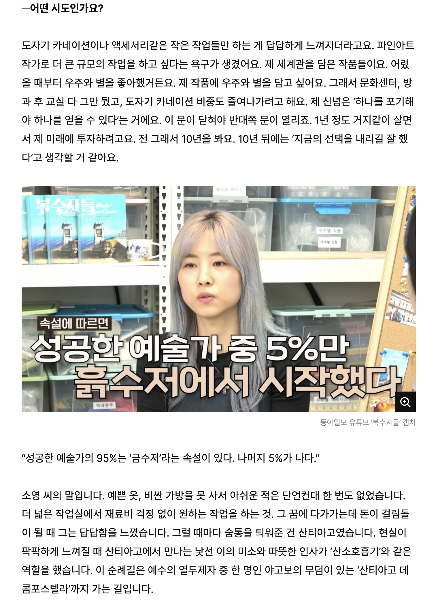 그렇게 김소영 작가는 첫 번째 산티아고 순례길 후 전업 도자기 작가로서 삶의 방향을 전환했다. 쉽지 않았다. 가진 것 없는 취업준비생이 갑자기 전업 작가로 삶을 꾸려나갈 순 없었다. 초반엔 작업실을 마련하고자 돈을 빌려 작품 활동을 했다. 생계를 위해 문화센터, 방과 후 교실 등에서 어린이 미술 강습 강사로 활동하기도 했다. 밑바닥부터 시작한 것이다.