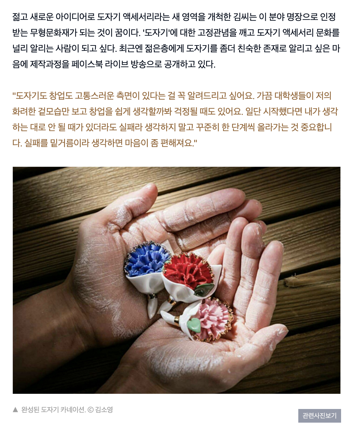 참신한 아이디어로 도자기 액세서리라는 새 영역을 개척한 그는 이 분야 명장으로 인정받는 무형문화재가 되는 것이 꿈이다. ‘도자기’에 대한 고정관념을 깨고 도자기 액세서리 문화를 널리 알리는 사람이 되고 싶다. 도자기를 좀더 친숙한 존재로 알리고 싶은 마음에 제작과정을 페이스북 라이브 방송으로 공개하는 것도 그 연장선상이다.